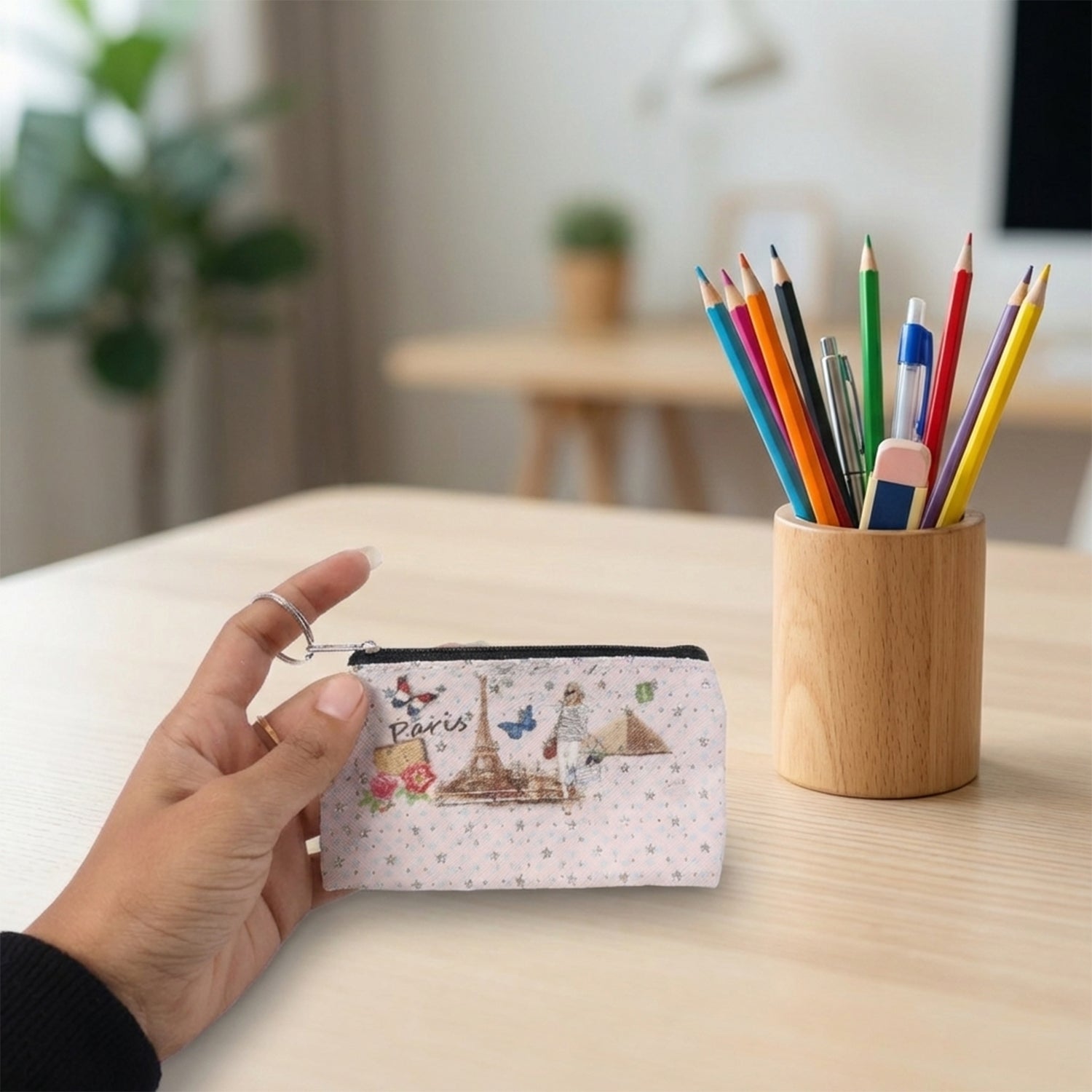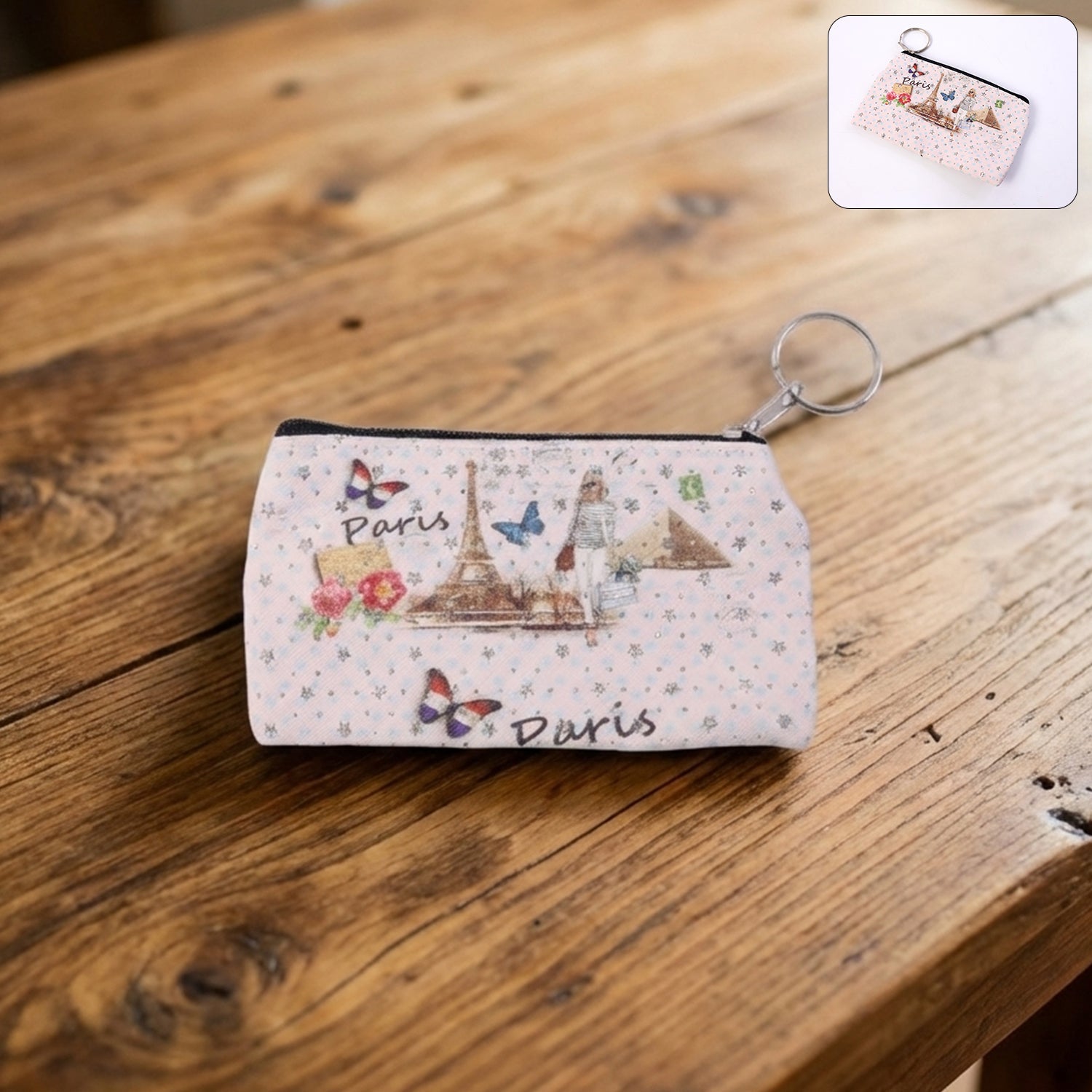 This small Paris print zipper pouch is a charming and practical solution for organizing everyday essentials in a compact form. Designed with a secure zip closure and an attached key ring, it allows easy carrying inside bags or direct attachment to keys and backpacks. The neatly stitched structure helps keep small items safely stored while remaining lightweight and easy to handle. Ideal for daily use, this pouch combines utility with an elegant printed design that adds a stylish touch to routine organization.