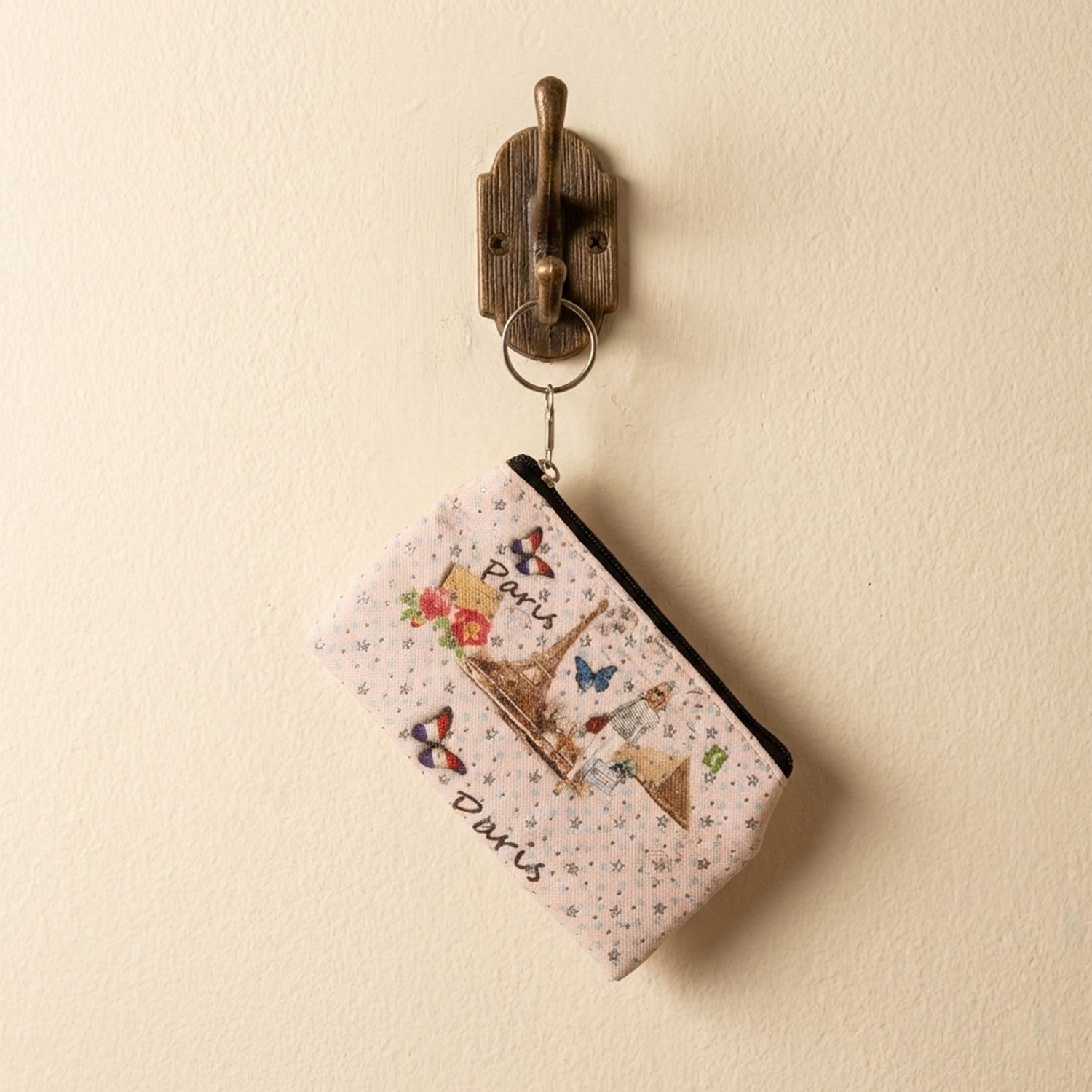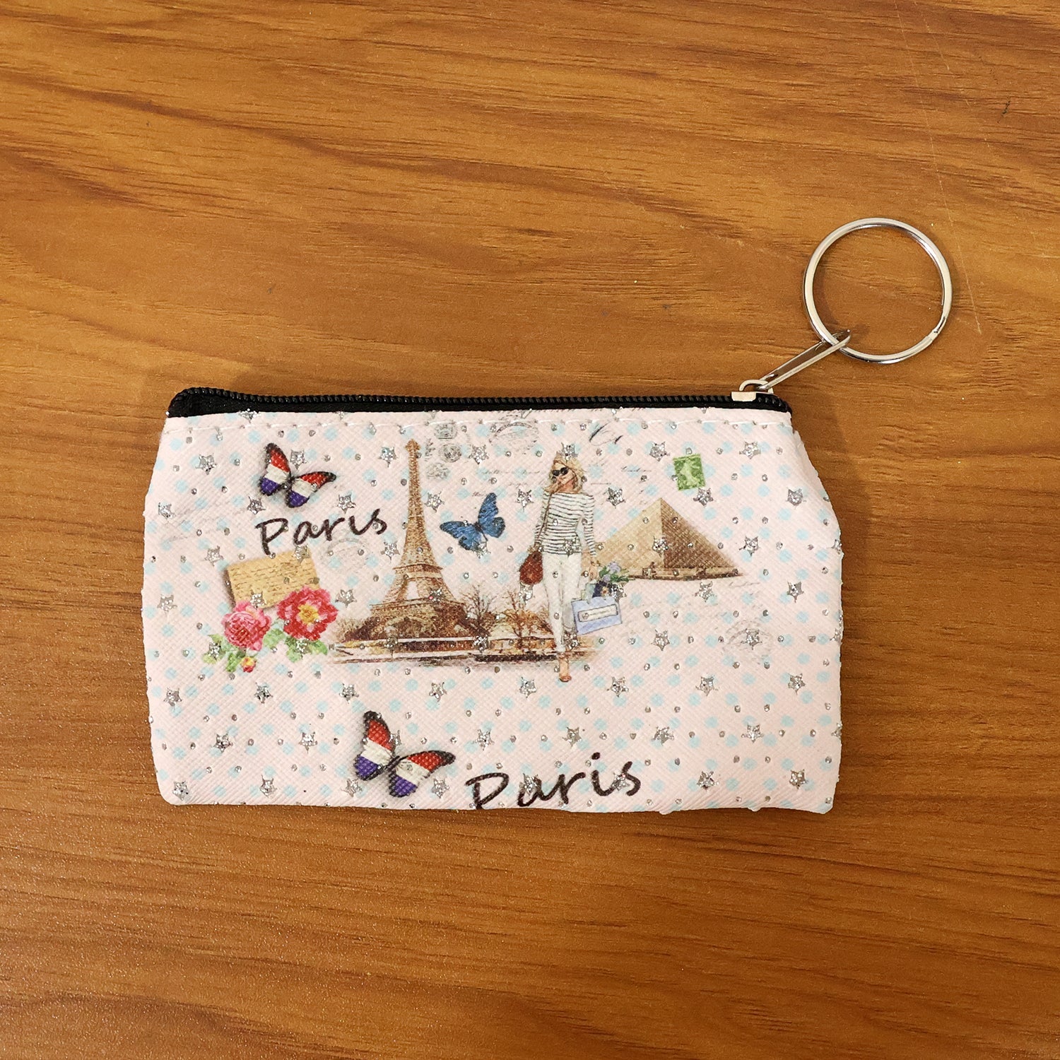 Small Paris Print Zipper Coin & Stationery Pouch with Key Ring Ð Compact Multipurpose Storage Pouch for Coins, Pens, Cards & Daily Essentials (1 Pc)