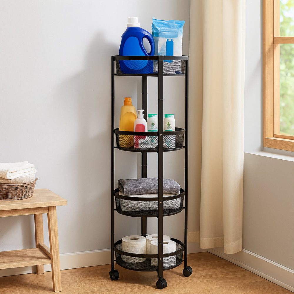 Organize your space in style with this 4-layer round metal mesh storage rack. Built with sturdy iron and finished in sleek black, this tall and slim rolling utility cart offers both functionality and aesthetic appeal. Its breathable mesh baskets are ideal for storing towels, fruits, toiletries, stationery, or kitchen items, while the 360° rotating wheels allow for easy mobility across rooms. Whether used in the kitchen, living room, bathroom, or office, this elegant storage rack keeps essentials accessible and organized without occupying much space.